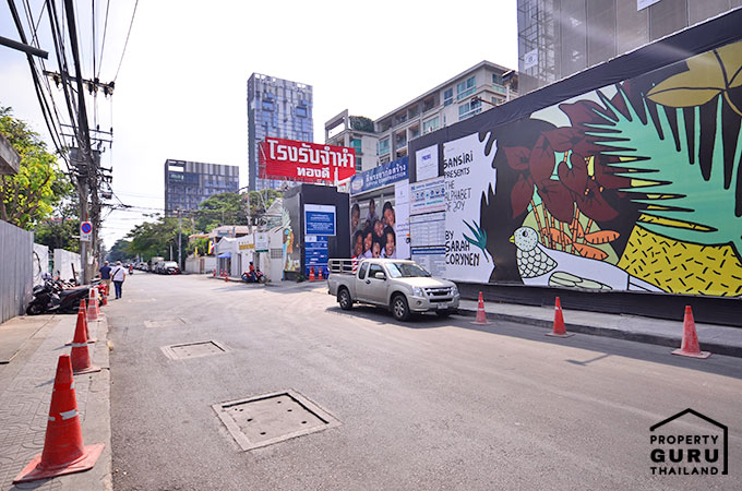 ปากซอยทองหล่อ สังเกตฝั่งตรงข้ามที่ล้อมรั้วไว้เป็นพื้นที่ก่อสร้างโรงแรม Jen Thonglor Bangkok by Shangri-La