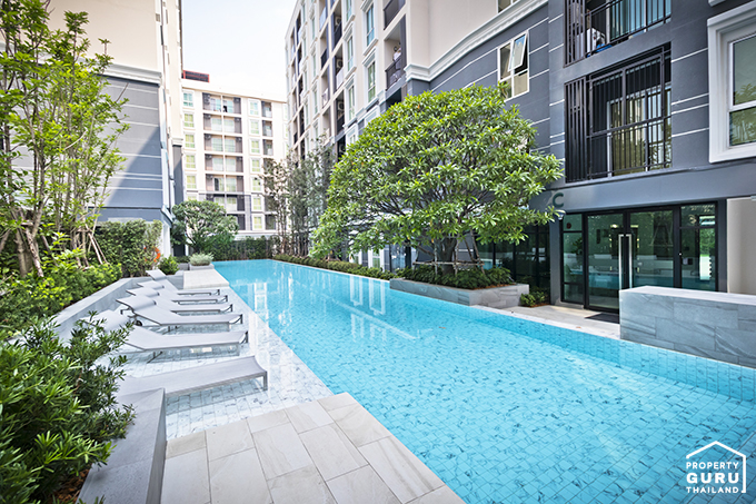 ถัดเข้ามาด้านในโครงการ Highlight ก็คือสระว่ายน้ำระบบเกลือยาว 55 เมตร โอบล้อมด้วยอาคารทำให้ไม่ร้อนตลอดทั้งวัน