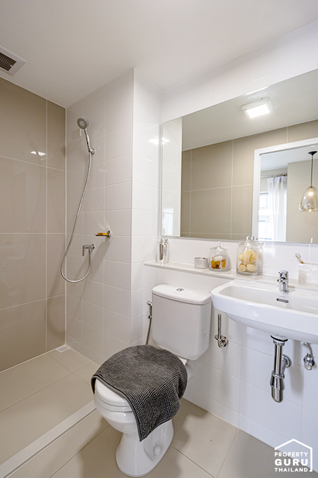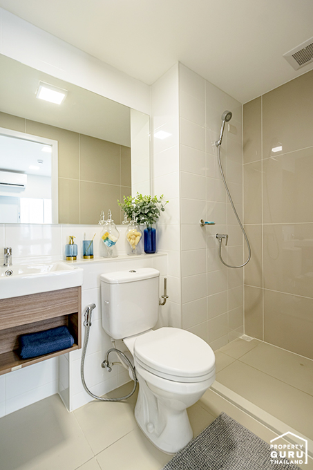 ห้องน้ำจะได้แบบนี้เลยค่ะ อาจจะต้องติดตั้งผ้าม่านหรือกระจกกันน้ำกระเด็นบริเวณห้องอาบน้ำเพิ่มเติม