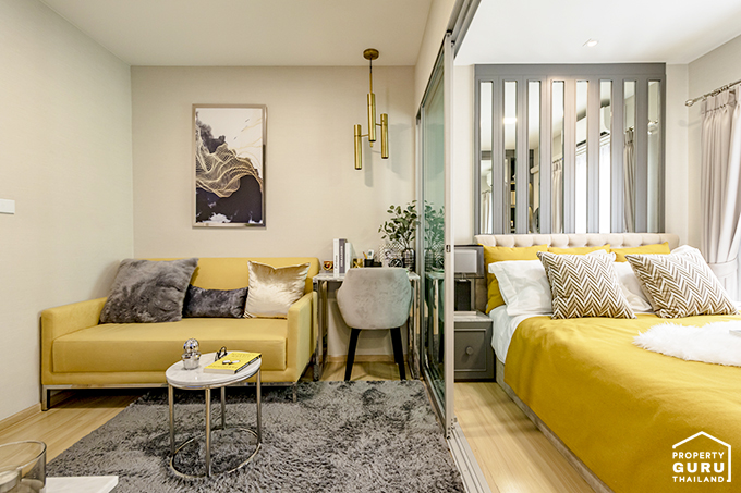 ห้องนั่งเล่นและห้องนอนจะถูกกั้นด้วยประตูกระจกบานเลื่อน