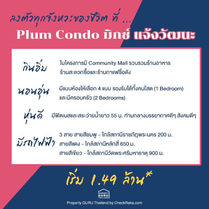 สวัสดีปีหนู 2020 ค่ะทุกคน ปีใหม่มาได้ไม่นานอยากหาบ้านอยู่กันหรือยัง? ปีที่แล้วใครมีแผนว่าจะซื้อคอนโด แต่ว่ายังชักเย่อในใจอยู่ ปีนี้ก็ไม่ต้องรอแล้วนะคะ เพราะวันนี้เราจะพาไปดูคอนโดราคาเริ่มต้น 1.49 ล้าน เท่านั้น! ดีไซน์สวย และใกล้รถไฟฟ้าถึง 3 สาย ติดถนนแจ้งวัฒนะ นั่นก็คือ Plum Condo มิกซ์ แจ้งวัฒนะ สร้างเสร็จพร้อมอยู่เมื่อปลายปีที่แล้วนี่เอง ถ้าใครได้ครอบครองละก็คุ้มแน่ๆ เพราะทั้งราคาดี ทำเลได้ แถมบรรยากาศดีจนอยากชวนเพื่อนมาปิคนิคหรือปาร์ตี้ ไม่ต้องไปไหนไกลเลยจ้า