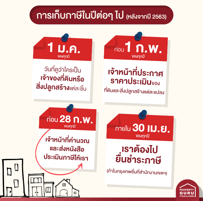 สาเหตุที่เลื่อนก็มีหลายอย่างทั้งความไม่พร้อมของหน่วยงานรัฐ และกฎหมายลำดับรอง (กฎหมายลูก) ที่ต้องออกมารองรับเรื่องนี้ยังไม่เรียบร้อย สำหรับราคาประเมินทุนทรัพย์ที่จะใช้สำหรับการเสียภาษีที่ดินและสิ่งปลูกสร้างในปี 2563 จะใช้ราคาประเมินของกรมธนารักษ์รอบบัญชีราคาประเมิน ปี 2559-2562 มาใช้ไปก่อน และสำหรับปีต่อๆ ไประยะเวลาการต้องเสียภาษีจะเป็นดังนี้