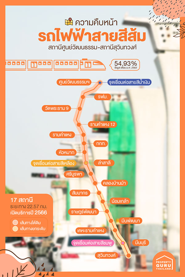 แนวเส้นทางจะเริ่มจากสถานีศูนย์วัฒนธรรม จุดนี้เชื่อมต่อกับรถไฟฟ้าสายสีน้ำเงิน เป็นเส้นทางใต้ดิน ตัดเข้าพื้นที่ของ รฟม. วิ่งใต้แนวถนนพระราม 9 ลอดไปตามใต้ทางด่วนฉลองรัฐ (รามอินทรา-อาจณรงค์) จากนั้นไปเลี้ยวซ้ายเข้าแยกพระราม 9 วิ่งไปตามถนนรามคำแหง ผ่านสี่แยกลำสาลี เชื่อมกับรถไฟฟ้าสายสีเหลืองที่จุดนี้เลยค่ะ ซึ่งจุดนี้จะเริ่มเปลี่ยนไปเป็นทางระดับแล้วค่ะ ผ่านหมู่บ้านสัมมากรไป ข้ามแนวถนนกาญจนาภิเษก ผ่านมีนบุรีจุดนี้ไปเชื่อมกับรถไฟฟ้าสายสีชมพูด้วยนะคะ แล้วไปสิ้นสุดที่บริเวณแยกถนนรามคำแหงตัดกับถนนสุวินทวงศ์ค่ะ ตามกำหนดการแล้วเราน่าจะได้ใช้บริการรถไฟฟ้าสายนี้ในช่วงปี 2566 ที่ดินตามแนวรถไฟฟ้าเส้นนี้น่าจะขยับขึ้นเรื่อยๆ Developer ก็เริ่มหาที่ดินสร้างบ้านและคอนโดกันมากขึ้นเรื่อยๆ แน่นอนว่า Checkraka.com จะมาอัปเดตให้ชมกันแน่นอนค่ะ