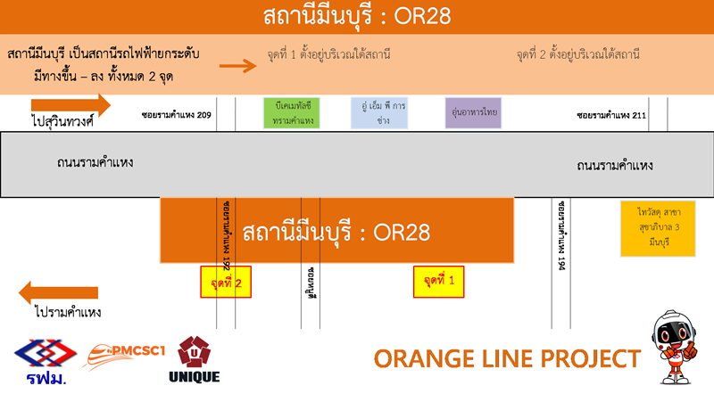 - ทางขึ้นลงจุดที่ 2 ตั้งอยู่บริเวณซอยรามคำแหง 166 ใกล้หมู่บ้านธรากร