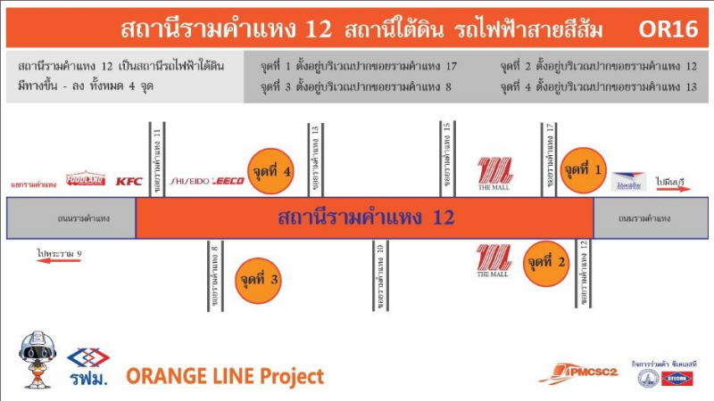 - ทางขึ้นลงจุดที่ 2 บริเวณปากซอย รามคำแหง 12 อยู่เยื้องๆ กับเดอะมอลล์ รามคำแหง
