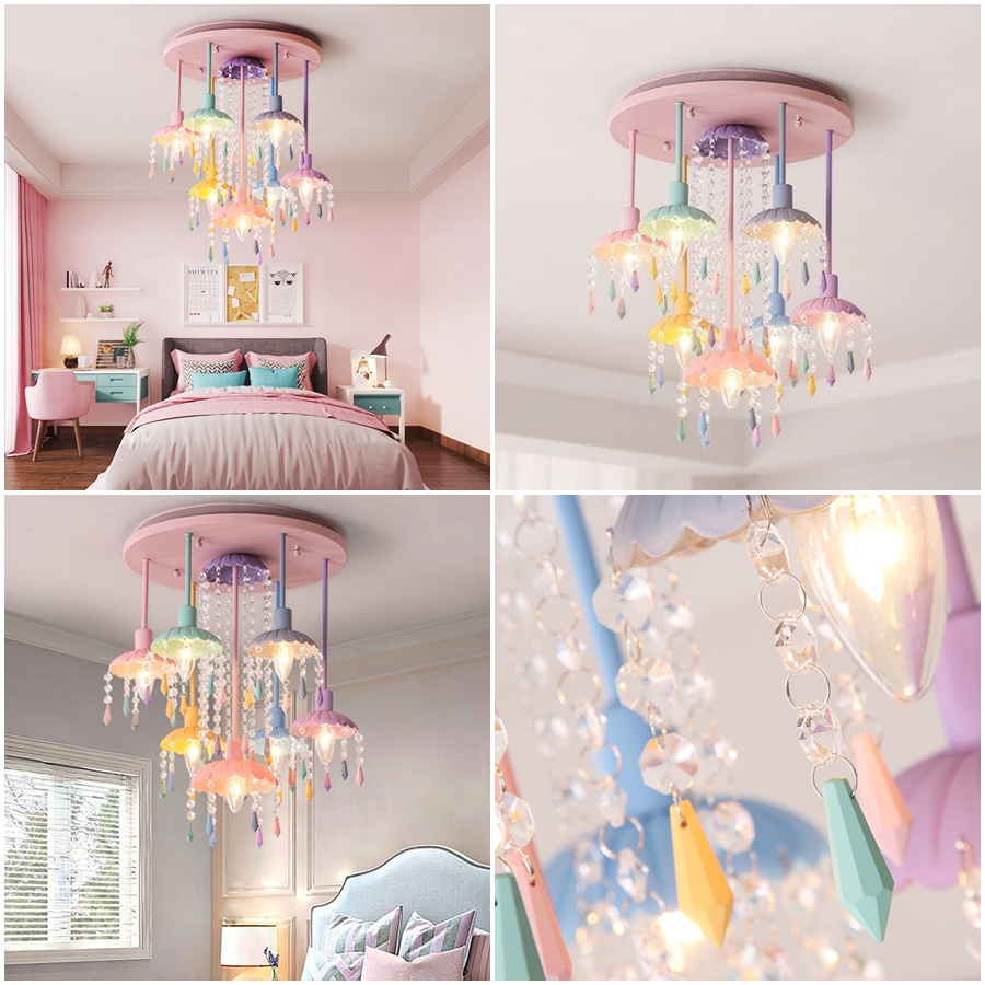 ลองหาโคมไฟแชนเดอเรียคริสตัลสีรุ้งพาสเทลหวานๆ มาตกแต่งไว้บนเพดาน จะทำให้ห้องดูหรูหรา