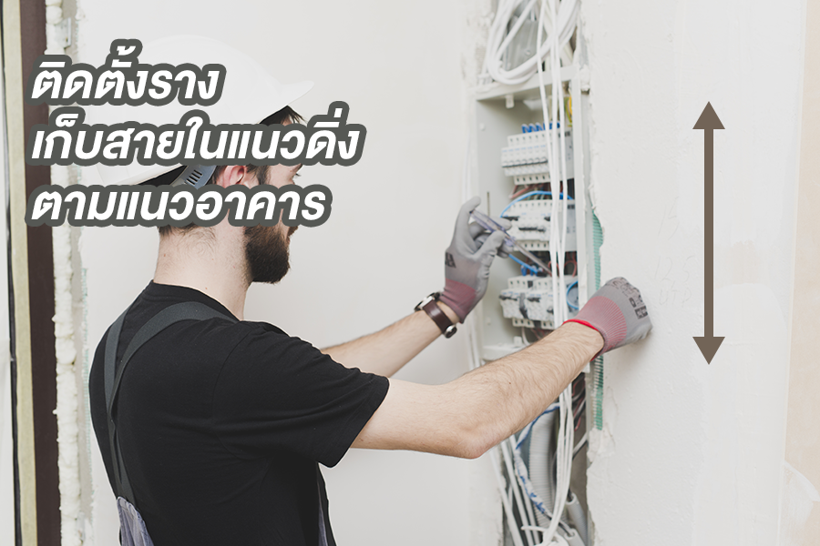 2. ติดตั้งรางเก็บสายในแนวดิ่ง เพื่อส่งสายไปในแต่ละชั้นของอาคาร และติดตั้งกล่องกระจายสัญญาณ เพื่อรองรับการเชื่อมต่อสายไฟเบอร์เข้าห้อง