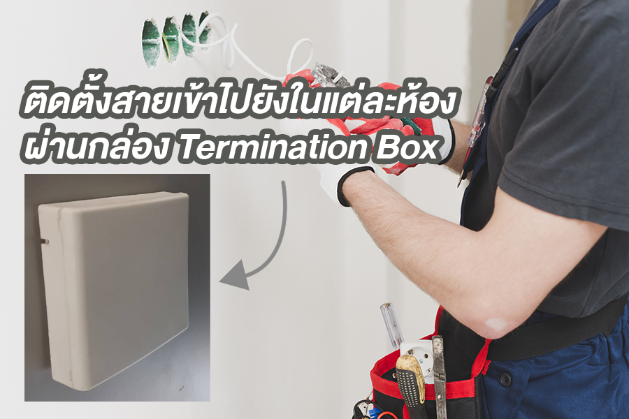 4. ติดตั้งสายเข้าไปยังในแต่ละห้อง ผ่านกล่อง Termination Box เท่านี้ก็มี Fiber Optic อยู่ในห้องเราแล้วจ้า สามารถไปติดต่อผู้ให้บริการอินเทอร์เน็ต เลือกแพ็กเกจที่สนใจได้เลย