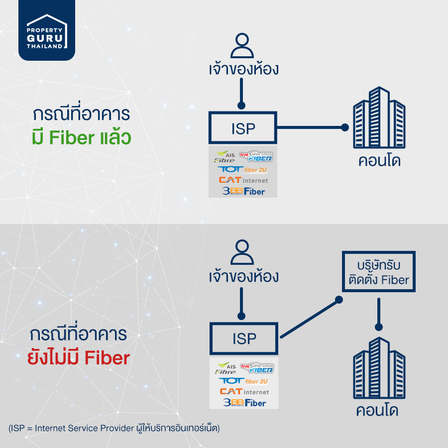 แต่ถ้าคอนโดไหนที่มีการติดตั้งสายไฟเบอร์แล้ว ถ้าจะติดตั้งอินเทอร์เน็ตแบบ Fiber Optic ไปเลยก็น่าจะเป็นเรื่องที่ดีเลย เราสามารถเดินไปติดต่อสอบถามกับทางผู้ให้บริการอินเทอร์เน็ตที่เราสนใจได้เลย ส่วนในกรณีที่คอนโดไม่มีสายไฟเบอร์ แต่เราอยากได้ต้องทำอย่างไร? เราสามารถยื่นเรื่องต่อนิติบุคคลเพื่อพิจารณาการติดตั้งสาย Fiber Optic ภายในอาคาร ก็ได้เหมือนกันค่ะ แต่สำหรับบริษัทที่จะเดินสาย Fiber ให้ก็จะมีข้อแม้อยู่บ้าง เช่น มีจำนวนยูนิตเพียงพอไหม? หรือ มีผู้ใช้งานตามเปอร์เซ็นต์ที่กำหนดไหม? เป็นต้น เพื่อที่จะได้คุ้มค่าต่อการติดตั้ง เนื่องจากการติดตั้งระบบเดินสาย Fiber ในอาคารสูงนั้นค่อนข้างเป็นเรื่องที่ยุ่งยาก ซับซ้อน และมีค่าใช้จ่ายสูงอยู่เหมือนกัน