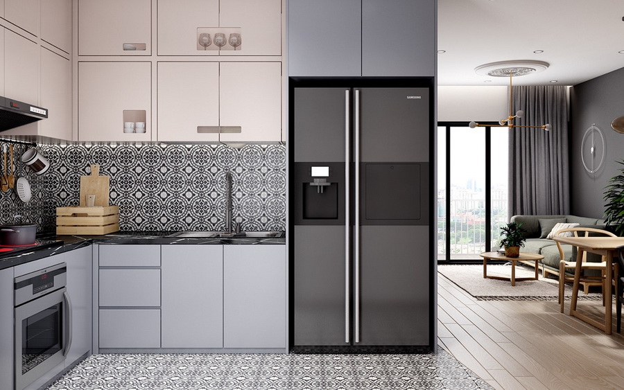 พื้นที่ครัว หรือ Pantry ที่ไม่ได้เป็นเป็นแบบครัวปิด ก็อาจจะตกแต่งให้ดูเป็นพื้นที่แยกจากส่วนอื่นด้วยการแต่งพื้น และวอลเปเปอร์เป็นอีกลายไปเลยก็ได้ค่ะ แต่ยังคงคอนเซ็ปต์โทนสีสว่าง และสีเทา