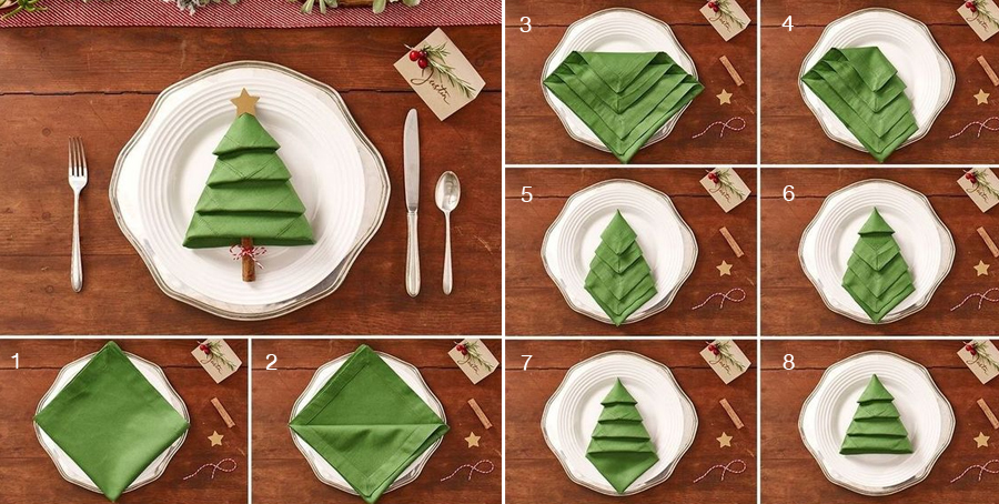 แต่ถ้าอยากได้ต้นคริสต์มาสก็ไม่ยาก ลองหาผ้าสีเขียวมาพับไปพับมาตามแบบนี้ก็ได้แล้ว