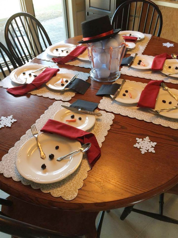 เพียงเปลี่ยนรูปแบบการจัดจานอาหารแบบเดิม เพิ่มเติมด้วยผ้าสีแดง-ดำ บวกการตกแต่งอีกนิดหน่อย เราก็จะได้กองทัพ Snowman มาอยู่บนโต๊ะอาหารแล้ว