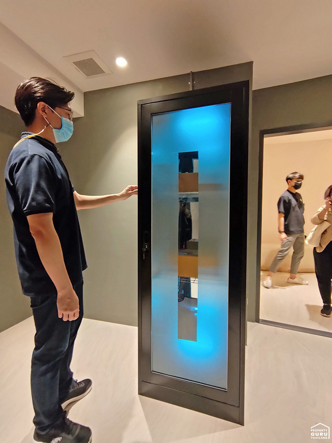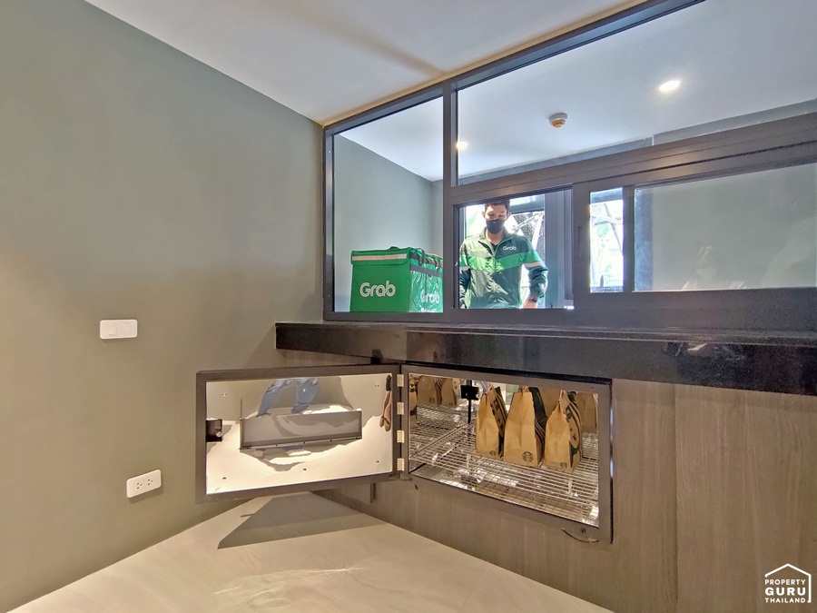 จุดสำหรับรับ-ส่ง อาหาร Delivery เป็นอีกหนึ่งจุดที่ออกแบบมาเพื่อรองรับกับพฤติกรรมการบริโภคอาหารในยุค New Normal บางโครงการจัดอยู่ในพื้นที่เปิดโล่งแบบที่มีอากาศถ่ายเทได้สะดวก และบางโครงการจัดห้องเป็นสัดส่วน เว้นระยะห่างระหว่างผู้ส่งอาหารและผู้พักอาศัย หลีกเลี่ยงการสัมผัสตัวกันโดยตรง และยังมีช่องส่งอาหารที่มีระบบฆ่าเชื้อโรคด้วย UV ก่อนที่ลูกบ้านจะรับอาหารจากพนักงานส่งอาหาร