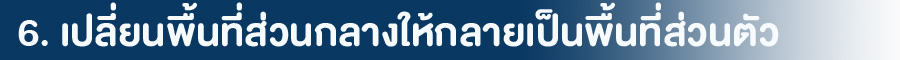 ออกแบบพี้นที่ส่วนกลางให้มีความเป็นส่วนตัวมากยิ่งขึ้นคำนึงถึง Social Distancing ด้วยการจัดแบ่งพื้นที่ให้เป็นสัดส่วนถึงแม้ว่าจะมีลูกบ้านลงมาใช้งานพร้อมๆ กัน นอกจากนี้บางโครงการยังยกระดับความปลอดภัยเพิ่มขึ้นไปอีกด้วยการเปิดให้มีการจองสิทธิ์ในการใช้งานพื้นที่ส่วนกลางผ่านมือถือ อยากใช้วันไหน เวลาอะไร ก็จองไว้ก่อนล่วงหน้าได้เลย เช่น ห้องประชุม หรือห้อง Co-working Space ฯลฯ จะได้ใช้ด้วยความสบายใจและเป็นส่วนตัวเฉพาะกรุ๊ปเราเท่านั้น เรียกได้ว่าได้ความเป็นส่วนตัวและความปลอดภัยขึ้นสูงสุด
