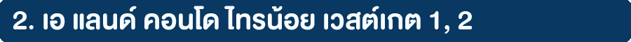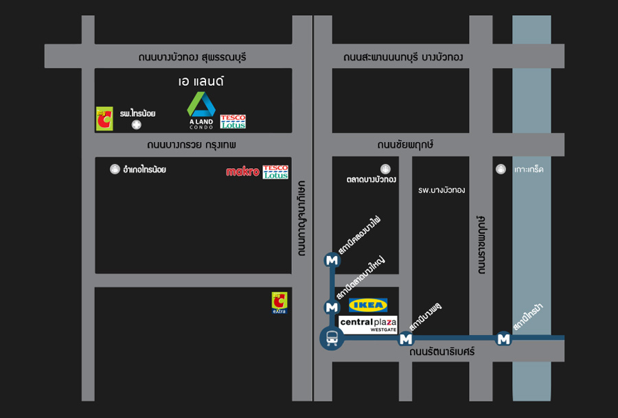 เอ แลนด์ คอนโด เวสเกต-ไทรน้อย (A Land Condo Sai Noi Westgate) คอนโดใหม่ที่ตอบโจทย์ไลฟ์สไตล์ของคนรุ่นใหม่ ใกล้ศูนย์การค้าชั้นนำขนาดใหญ่ อาทิ Central Westgate, IKEA บางใหญ่ เดินทางสู่ใจกลางเมืองด้วยรถไฟฟ้าสายสีม่วง เพียง 800 เมตร ถึง BIg C ไทรน้อย และ Lotus ไทรน้อย เพียง 500 เมตร ถึงการไฟฟ้าฝ่ายผลิต สาขาไทรน้อย (EGAT) มีรถตู้ถึง Central Westgate
