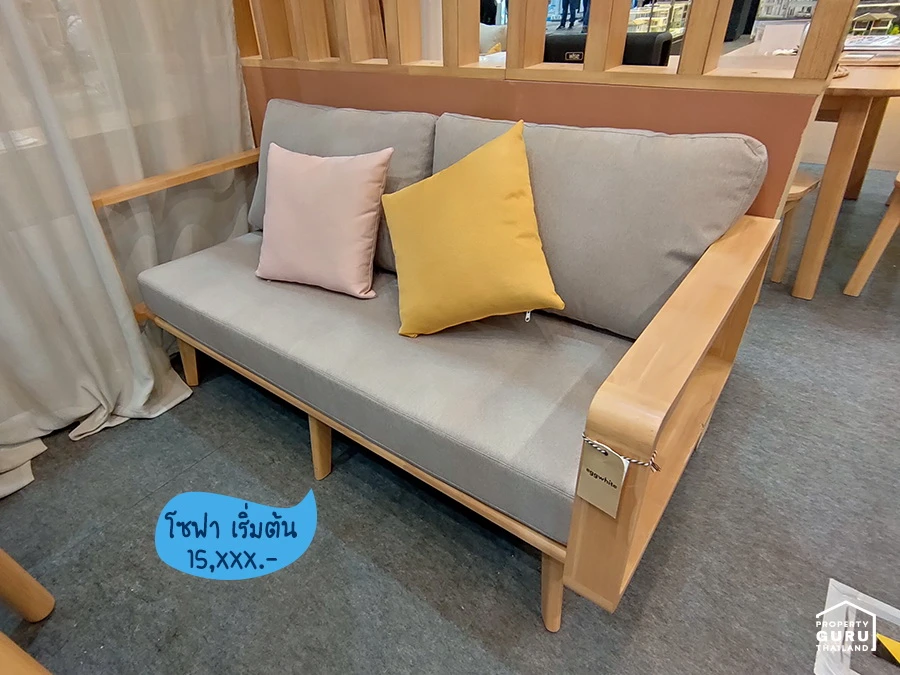 โซฟาจากร้าน egg white โครงเป็นไม้ยางพาราธรรมชาติ ตัวเบาะเป็นผ้าฝ้ายผสมโพลีเอสเตอร์ ขนาดเริ่มต้น 160 ซม. ราคาจะอยู่ที่ 15,xxx บาท