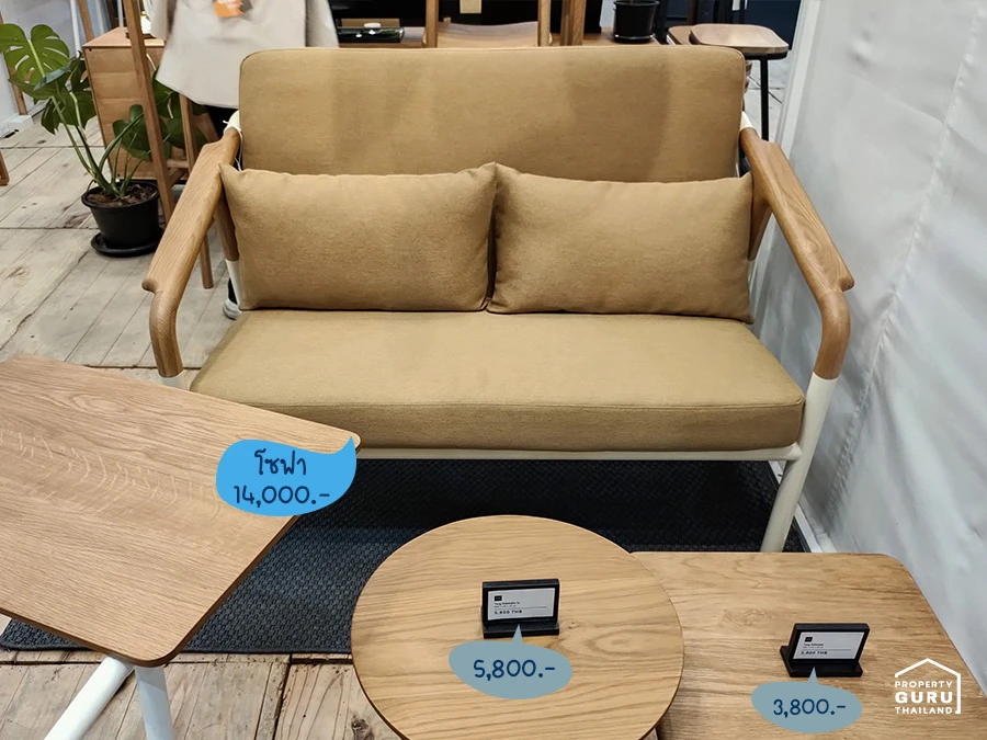 โซฟา 2 ที่นั่งจากร้าน Flo โครงเป็นไม้ผสมเหล็ก มาพร้อมกับโต๊ะกาแฟเล็ก 2 ขนาด