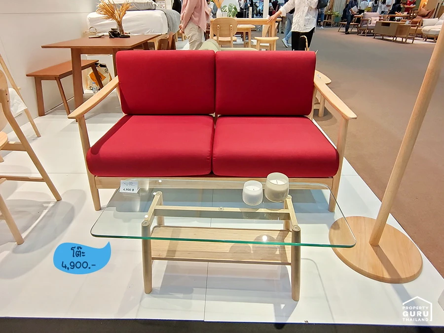 โซฟาสีแดงสดจากร้าน haru สวยมาก แต่ลืมถามราคามา T_T ส่วนโต๊ะรับแขกบานกระจกใสตัวนี้ 4,900 บาท