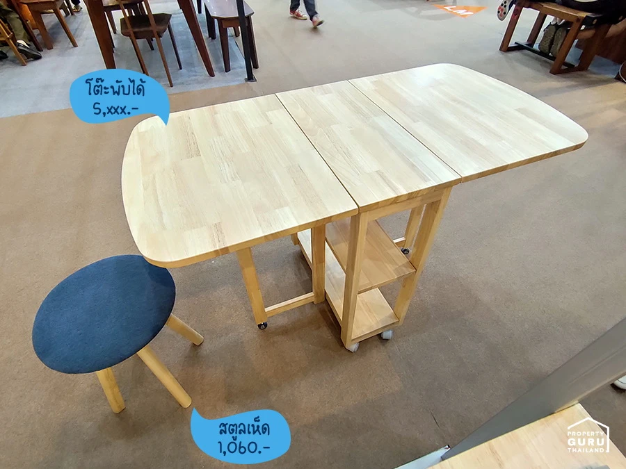 โต๊ะพับได้จากร้าน Easy Cozy เช่นกัน เหมาะกับชาวคอนโดอย่างยิ่งยวด เพราะทั้งประหยัดพื้นที่และน้ำหนักเบา มีล้อเคลื่อนย้ายได้สะดวก ตอนไม่ได้ใช้ก็พับเก็บได้ ไม่เปลืองเนื้อที่ สั่งจองในงานส่งให้ฟรีถีงบ้านเลยจ้า ส่วนเก้าอี้สตูลเห็ดเอาไปนั่งด้วย ขนาดพอดีกับโต๊ะเลยค่ะ