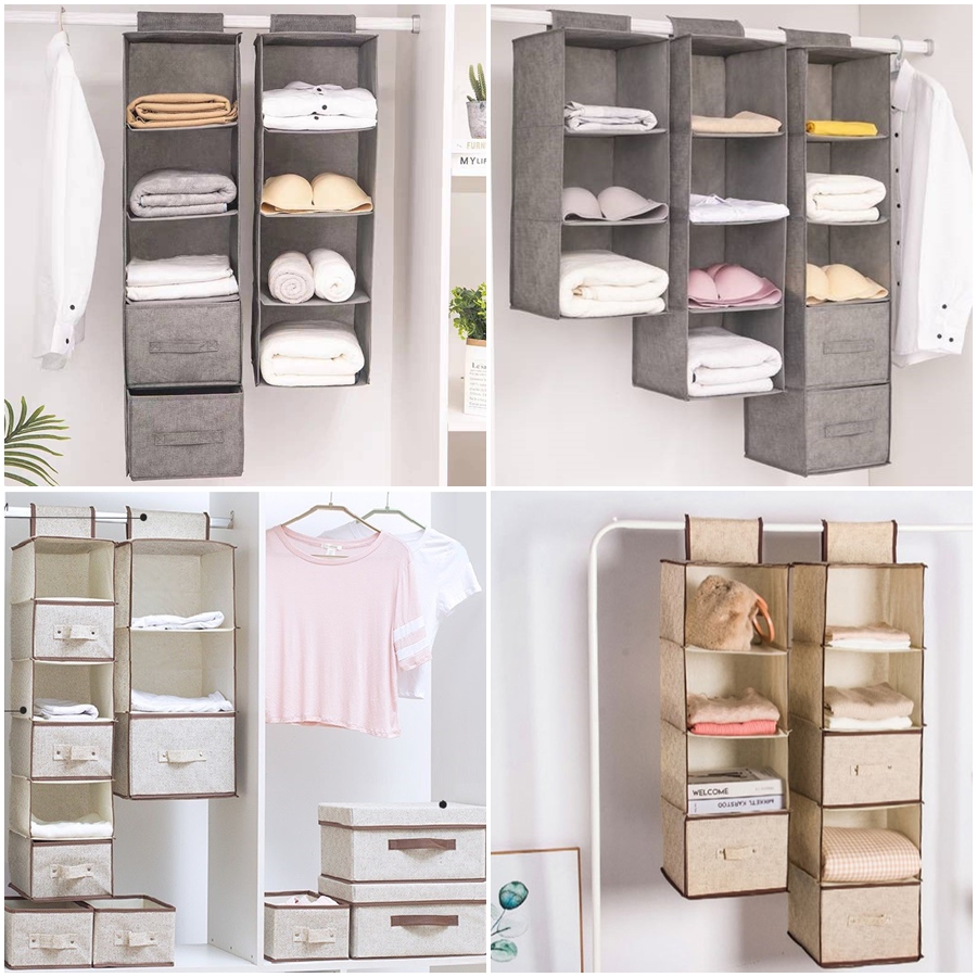 อีกหนึ่งไอเทมที่ช่วยจัดระเบียบตู้เสื้อผ้าให้เป็นระเบียบ คือ ชั้นแขวน หรือช่องจัดระเบียบแบบแขวน เพียงติดชั้นเข้ากับราวแขวนผ้า ก็สามารถแบ่งเป็นพื้นที่การใช้งานภายในตู้เสื้อผ้าออกเป็นสัดส่วนได้แล้ว ได้ทั้งชั้นวางของแบบเปิดโล่งสำหรับวางเสื้อผ้าตัวโปรดที่ต้องหยิบใช้งานเป็นประจำ และแบบลิ้นชักสำหรับเก็บของกระจุกกระจิก