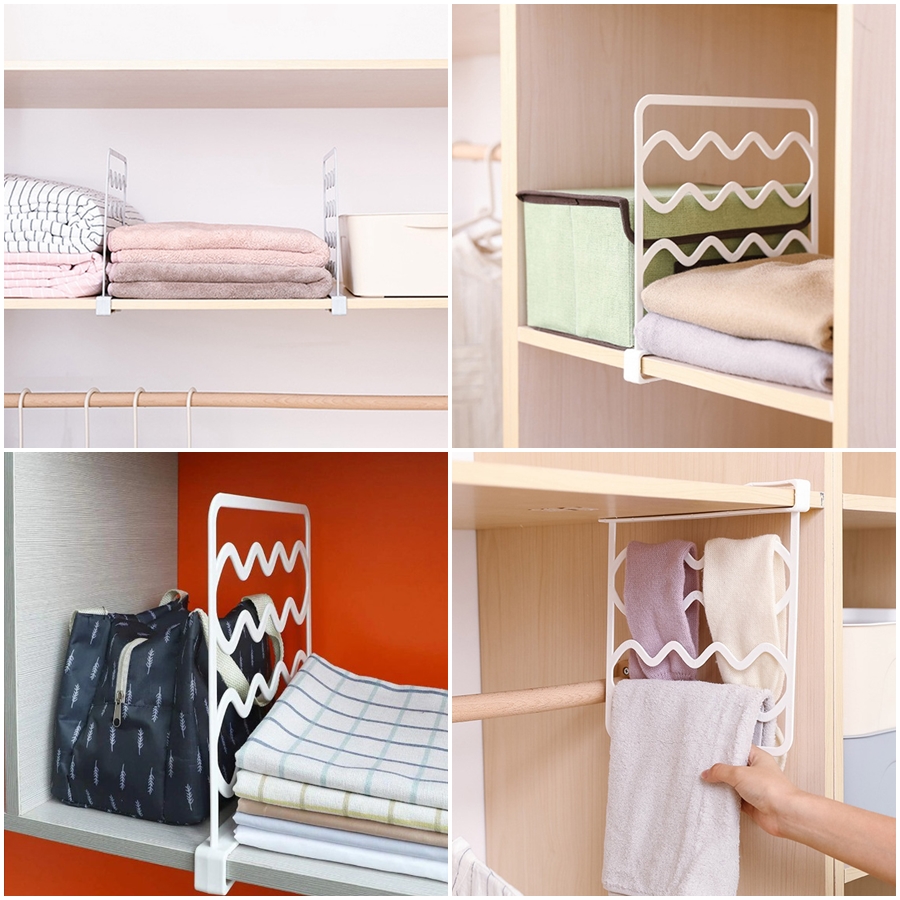 ที่กั้นจัดระเบียบที่มีหน้าตาคล้ายกับที่กั้นหนังสืออาจเป็นเพียงไอเทมชิ้นเล็กๆ แต่เป็นตัวช่วยที่ดีในการจัดระเบียบพื้นที่เหนือราวแขวนผ้า ที่ส่วนใหญ่แล้วจะออกแบบมาเป็นเพียงชั้นวางของแบบเปิดโล่งเท่านั้น ลองหาที่กั้นจัดระเบียบมาติดเพิ่มเข้าไป เพียงเท่านี้ก็จะสามารถแบ่งพื้นที่เก็บของให้เป็นระเบียบเรียบร้อยได้มากขึ้นแล้ว จะวางผ้าขนหนู วางกระเป๋า หรือวางกล่องเก็บของก็สะดวก