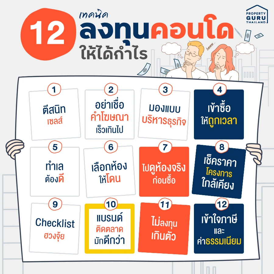 นอกจากปัจจัยการเลือกลงทุนคอนโดข้างต้นแล้ว ยังมีอีก 12 เทคนิคที่จะช่วยให้การลงทุนซื้อคอนโดครั้งนี้ได้กำไรดีและคุ้มค่ามากที่สุดมากฝากกันด้วย