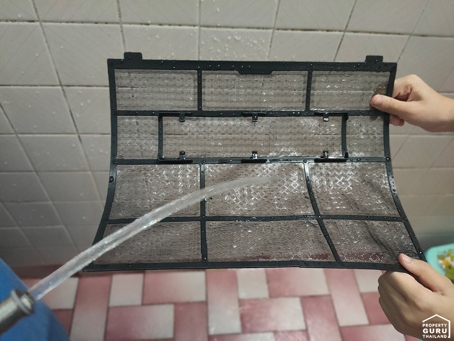 ให้ถอดแผ่นฟิลเตอร์นำไปล้างด้วยน้ำเปล่าธรรมดาหรือน้ำสะอาด