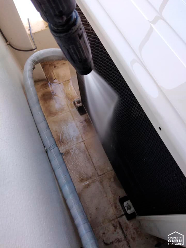 ล้างคอยล์เย็นเสร็จแล้วเราก็มาต่อกันที่คอยล์ร้อน โดยหากคอยล์ร้อนใครตั้งอยู่ที่ระเบียงหรือไม่สูงมากก็แนะนำให้ฉีดทำความสะอาดบริเวณด้านหลัง หรือใช้ผ้าชุบน้ำเช็ดเพื่อขจัดฝุ่นและสิ่งสกปรติออกไป เพื่อให้คอยล์ร้อนสามารถระบายความร้อนได้อย่างเต็มที่ แต่ไม่แนะนำให้ฉีดเข้าไปลึกถึงด้านในใบพัดนะคะ เพราะในนั้นจะมีมอเตอร์หรือแผงวงจรไฟฟ้าอยู่อาจทำให้เกิดความเสียหายได้