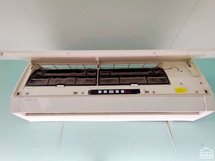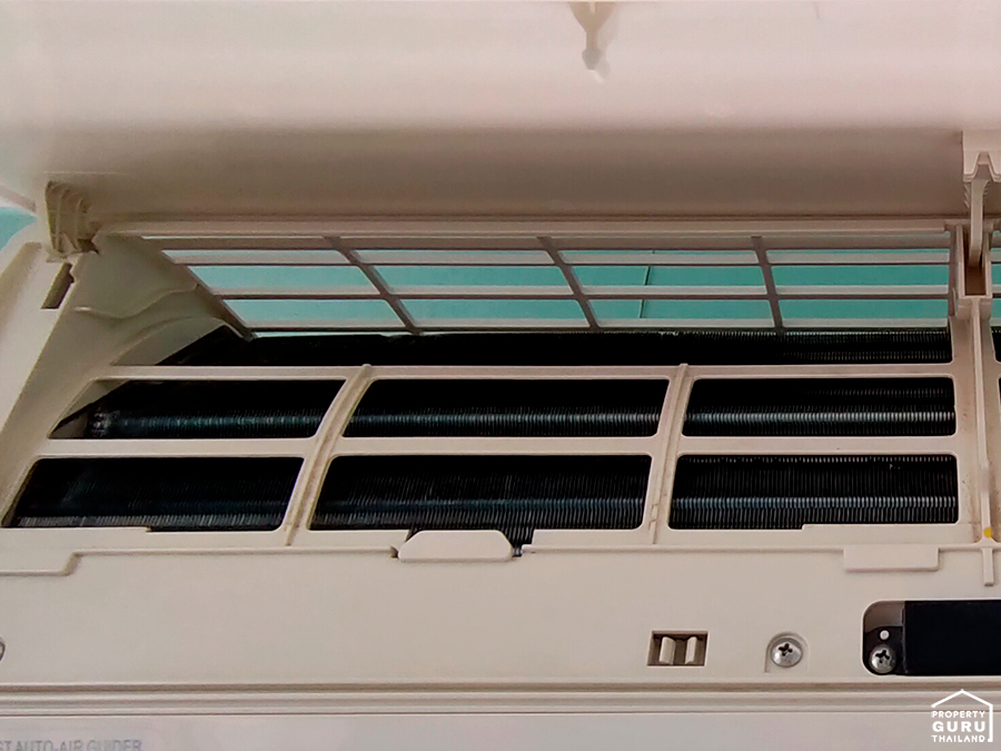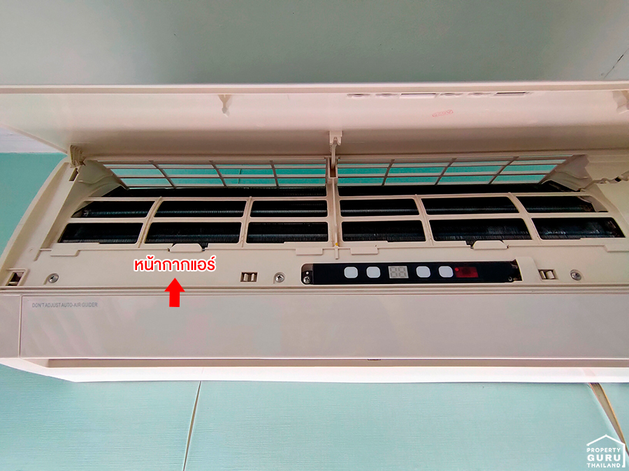 จากนั้นเปิดหน้ากากแอร์หรือฝาครอบด้านหน้าออก โดยการยกขึ้นด้านบน สำหรับบางเครื่องที่สามารถถอดออกได้ก็ให้ถอดออกมาล้างด้วยก็ดี