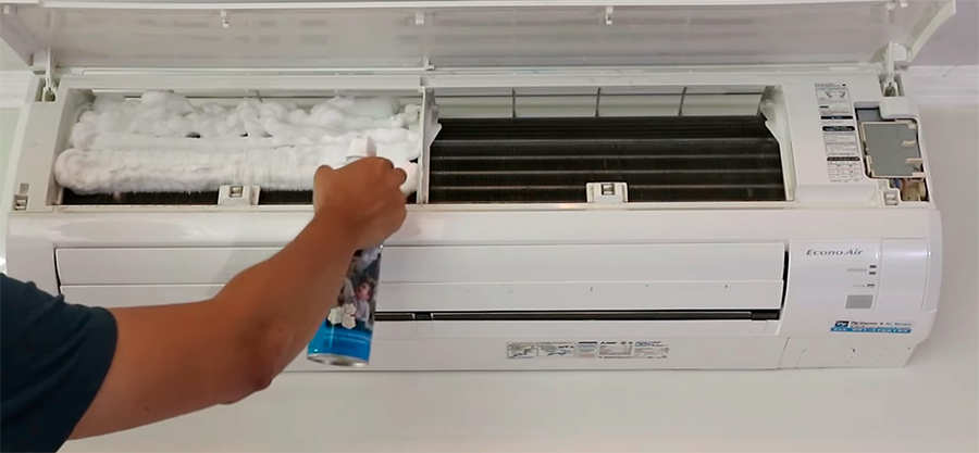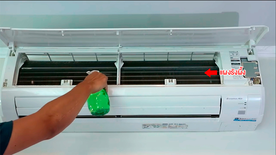 หลังจากนั้นฉีดโฟมสำหรับล้างแอร์ให้ทั่วแผงรังผึ้ง ก่อนฉีดควรเขย่าขวดก่อนเล็กน้อย โดยเว้นระยะห่างระหว่างแผงรังผึ้งกับกระป๋องฉีดประมาณ 30 มม.