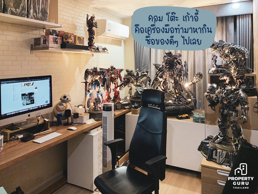คอนโดของคุณแบงค์เป็นคอนโด 2 ห้องนอน ที่แบ่งห้องหนึ่งมาทำเป็นห้องทำงาน หลักๆ แล้วการจัดวางห้องทำงานของคุณแบงค์จะเน้นความแข็งแรง ความทนทานของอุปกรณ์ต่างๆ เช่น คอมพิวเตอร์ โต๊ะทำงาน เก้าอี้ทำงาน และชั้นวางของ ต้องเป็นของดีๆ อาจจะราคาสูงไปบ้าง แต่ก็จะคุ้มค่ากับราคา เพราะสิ่งของเหล่านี้คือเครื่องมือหากิน ไม่ว่าจะทำงานที่ออฟฟิศ หรือทำงานที่บ้าน ของเหล่านี้ล้วนสำคัญค่ะ ส่วนตัวคุณแบงค์เป็นคนที่ชื่นชอบการสะสมโมเดล ของเล่นเป็นชีวิตจิตใจ จึงนำมาจัดวางเพิ่มบรรยากาศให้กับห้องทำงานของตัวเอง เลยทำให้มีความสุขในการทำงานไปด้วยนั่นเองค่ะ สำหรับใครที่ต้อง Work From Home อยู่ตอนนี้ นอกจากต้องนั่งทำงานอย่างเดียวแล้ว อาจจะลองหาไอเดียใหม่ๆ สร้างบรรยากาศในมุมทำงานด้วยสิ่งของที่ตัวเองชื่นชอบ ก็อาจจะทำให้การทำงานที่บ้านนั้นสนุก และมีสีสันขึ้นมาบ้างก็ได้นะคะ