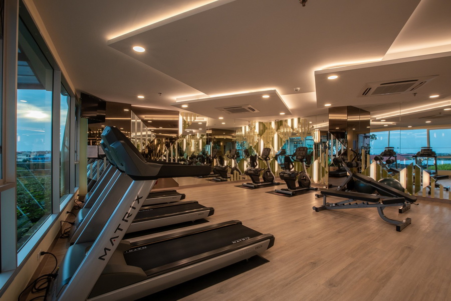 ห้องฟิตเนสที่ออกแบบพื้นที่บางส่วนเป็นกระจกสามารถเทควิวสระว่ายน้ำได้