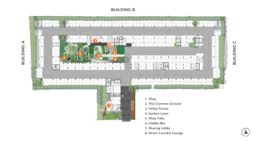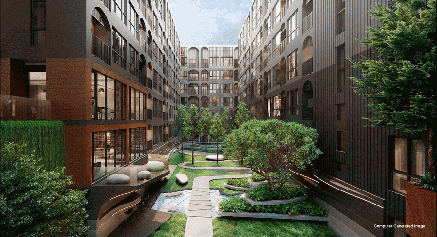พื้นที่สวนส่วนกลางที่โอบล้อมด้วยอาคารพักอาศัย