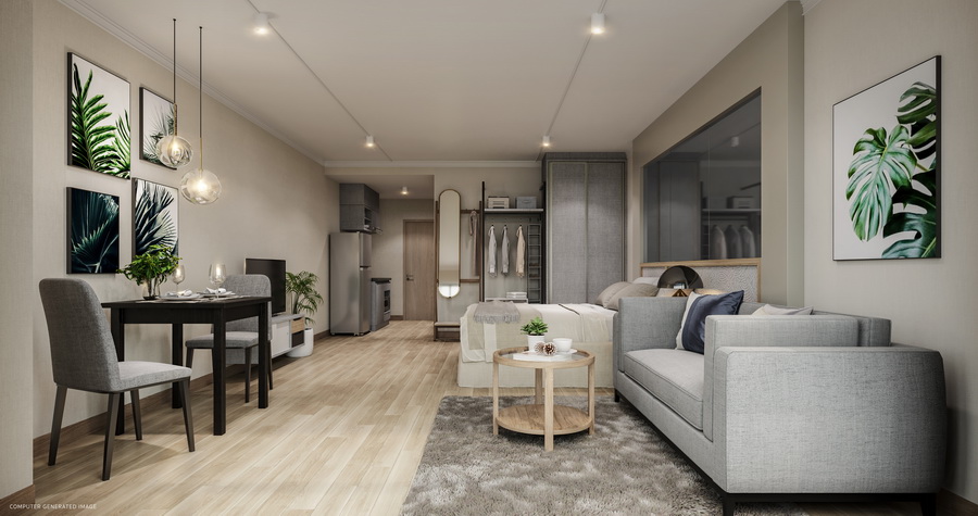 ภาพจำลองห้องตัวอย่างแบบ Studio ออกแบบมาในโทนสี Earth tone