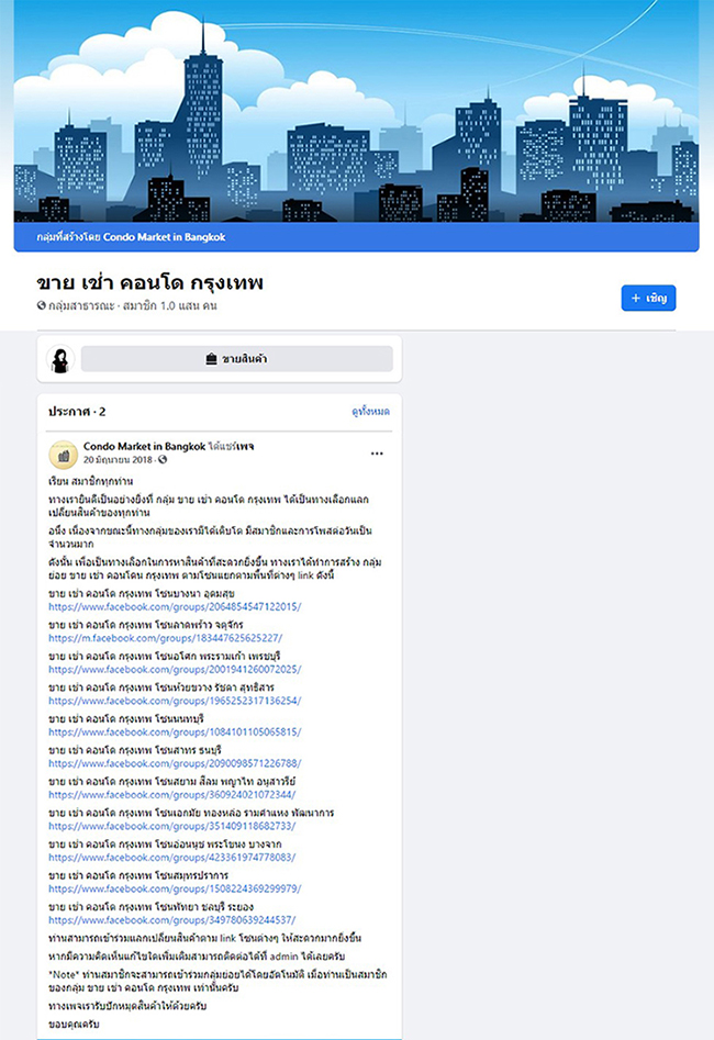 นอกจากนี้ช่องทางโซเชียลมีเดียก็มาแรงไม่แพ้กัน โดยเฉพาะช่องทาง Facebook Group เป็นช่องทางที่ดีมากที่สุดอย่างหนึ่ง เพราะเป็น Community รวมคนที่สนใจเรื่องเดียวกันมาพูดคุยแลกเปลี่ยนเรื่องที่สนใจเหมือนๆ กัน มีหลายกลุ่มที่สร้างกลุ่มขึ้นมาเพื่อให้เจ้าของโพสต์ปล่อยเช่าห้องคอนโด โดยแนบภาพและข้อมูลห้อง เพื่อให้ผู้เช่าเข้ามาเลือกและติดต่อผ่านเจ้าของห้องได้โดยตรง วิธีนี้ยังสามารถทำได้โดยที่ไม่เสียค่าใช้จ่าย และสามารถเข้าถึงกลุ่มผู้เช่าได้โดยตรงเลยค่ะ เช่น กลุ่ม "ขาย เช่า คอนโด กรุงเทพ" มีการแบ่งกลุ่มย่อยออกไปตามทำเลต่างๆ ข้อดีคือ เจ้าของห้องก็เข้าไปโพสต์ได้ตรงจุด ผู้เช่าเองก็เข้ามาเพื่อหาเช่าคอนโดในทำเลนี้โดยตรงได้เลย ทำให้แมทกันได้ง่าย ซึ่งยังมีอีกมากมายหลายกลุ่มให้เลือกเข้าไปโพสหาผู้เช่าค่ะ แต่ถ้าจะหว่านให้ครอบคลุมทุกช่องทาง ก็สามารถฝาก Property Agent หรือนายหน้าหาลูกค้าให้ แต่ก็มีข้อควรระวังนะคะ อ่านเพิ่มได้ที่ ให้เช่าคอนโดผ่าน Agent หรือแม้กระทั่งนิติฯ ของโครงการเรา ก็ฝากไว้ได้เผื่อมีลูกค้าเข้ามาหาห้องด้วยตัวเองค่ะ