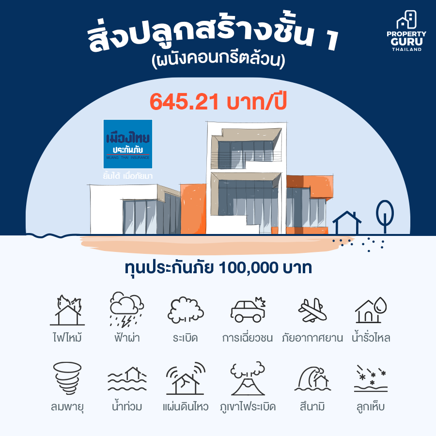 1. เมืองไทยประกันภัย สิ่งปลูกสร้างชั้น 1 (ผนังคอนกรีตล้วน) ราคา 645.21 บาท/ปี
