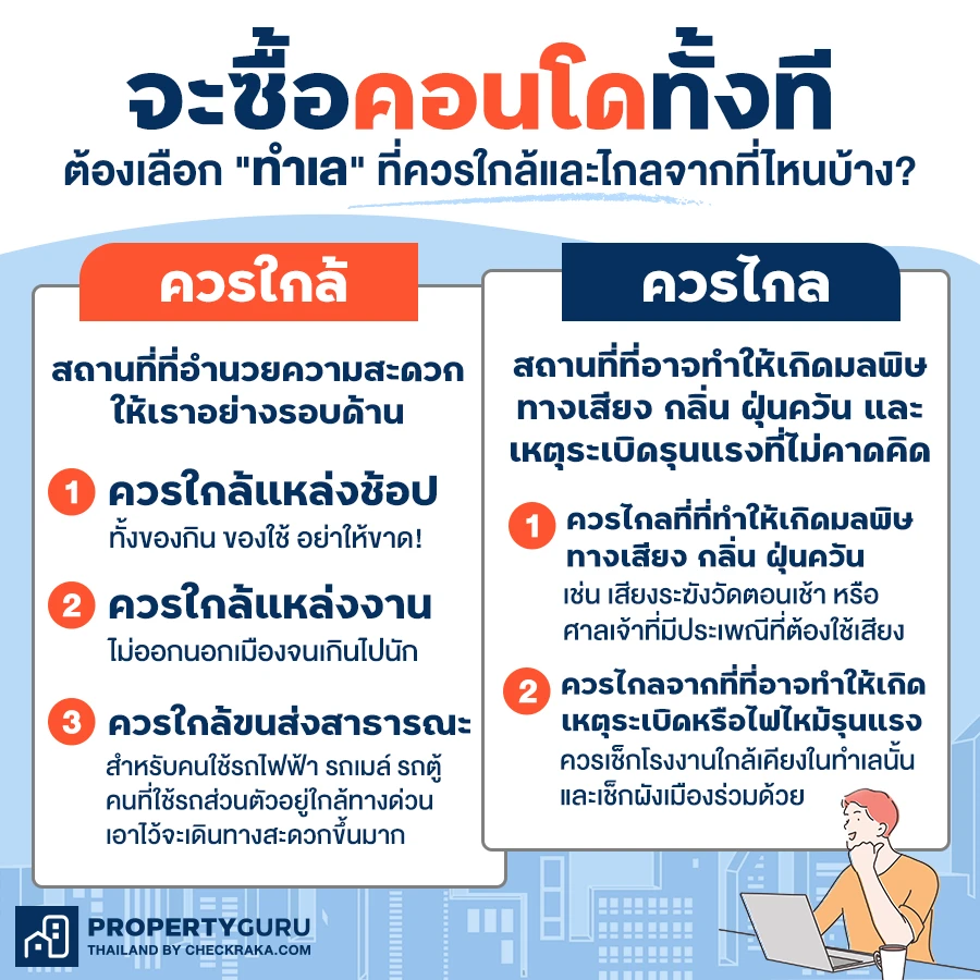 กำลังมองหาคอนโดใหม่กันอยู่หรือเปล่าคะ ช่วงนี้สถานการณ์ทำให้เราอยากมีพื้นที่ส่วนตัวมากขึ้น หลายคนเริ่มให้ความสำคัญกับ Space พอๆ กับ Location ซึ่งเมื่อก่อนมักให้ความสำคัญกับทำเลต้องใกล้รถไฟฟ้า ต้อง 0 เมตร ต้องเดินน้อยสุด แต่เมื่อมีสถานการณ์แพร่ระบาดโควิด-19 กลายเป็นว่า เราต้องอยู่ในห้องมากกว่าออกมาใช้ชีวิตข้างนอก กลับตาลปัตรจากหน้ามือเป็นหลังมือเลยทีเดียว บวกกับเมื่อช่วงต้นเดือน ก.ค. 2564 ที่ผ่านมา เกิดเหตุการณ์ไฟไหม้โรงงานกิ่งแก้วครั้งใหญ่ หมู่บ้านใกล้เคียงได้รับแรงกระแทกจากเหตุการณ์ครั้งนี้เยอะมาก ได้รับผลกระทบในวงกว้างจนเกิดข้อสงสัยว่า ทำไมโรงงานอุตสาหกรรมขนาดใหญ่ขนาดนี้ถึงตั้งอยู่ใกล้แหล่งชุมชนที่มีบ้านพักอาศัย มีผู้คนอยู่หนาแน่น จนเราต้องกลับมาทบทวนกันอีกครั้งว่า ตอนนี้เกณฑ์การเลือกทำเลคอนโดหรือทำเลบ้านไม่เหมือนก่อนแล้ว วันนี้เรามาอัปเดตให้ดูกันว่า จะซื้อ "คอนโด" ทั้งที ต้องเลือก "ทำเล" ที่ควรใกล้และไกลจากอะไรบ้าง?