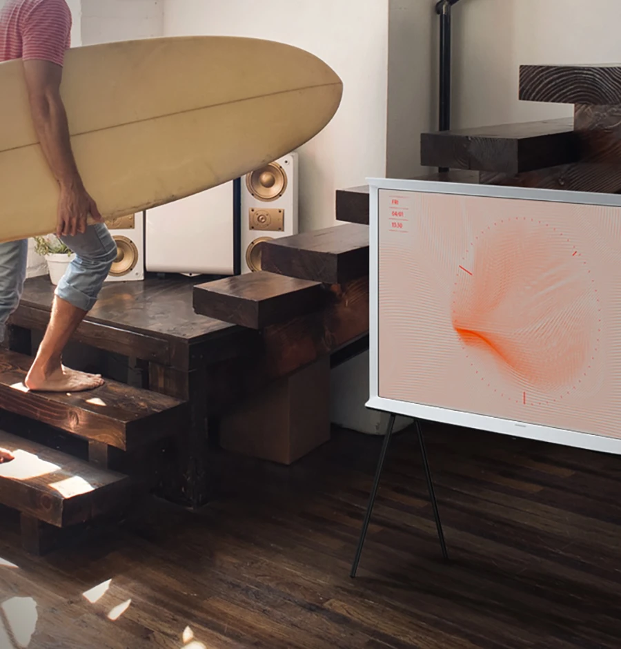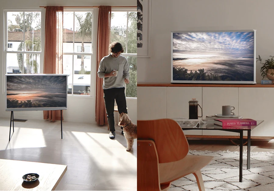 Samsung TV The Serif ทีวีที่ไม่ได้สร้างมาเพื่อวางชิดผนังเหมือนทีวีทั่วไป แต่ขาตั้งที่ให้มาสามารถถอดออกได้ ไม่ว่าจะวางเจ้า TV The Serif เครื่องนี้ไว้ตรงไหนก็ได้ในห้องก็ดูสวยงามมินิมอลไปหมด ซึ่งเหมาะมากๆ สำหรับบ้านที่ตกแต่งสไตล์ Minimal Modern หรือ Classic ออกแบบโดย Ronan และ Erwan Bouroullec สองพี่น้องนักออกแบบชื่อดังชาวฝรั่งเศส นับเป็นการรวมศิลปะกับเทคโนโลยีเข้าไว้ด้วยกันอย่างลงตัว และตอบโจทย์ความต้องการของผู้คนในเวลานี้ได้เป็นอย่างดีเลยทีเดียว มีให้เลือกแบบขนาดหน้าจอ 43 นิ้ว และ 55 นิ้ว ใครชอบเล็กชอบใหญ่จัด Size ที่แมทกับห้องได้เลย