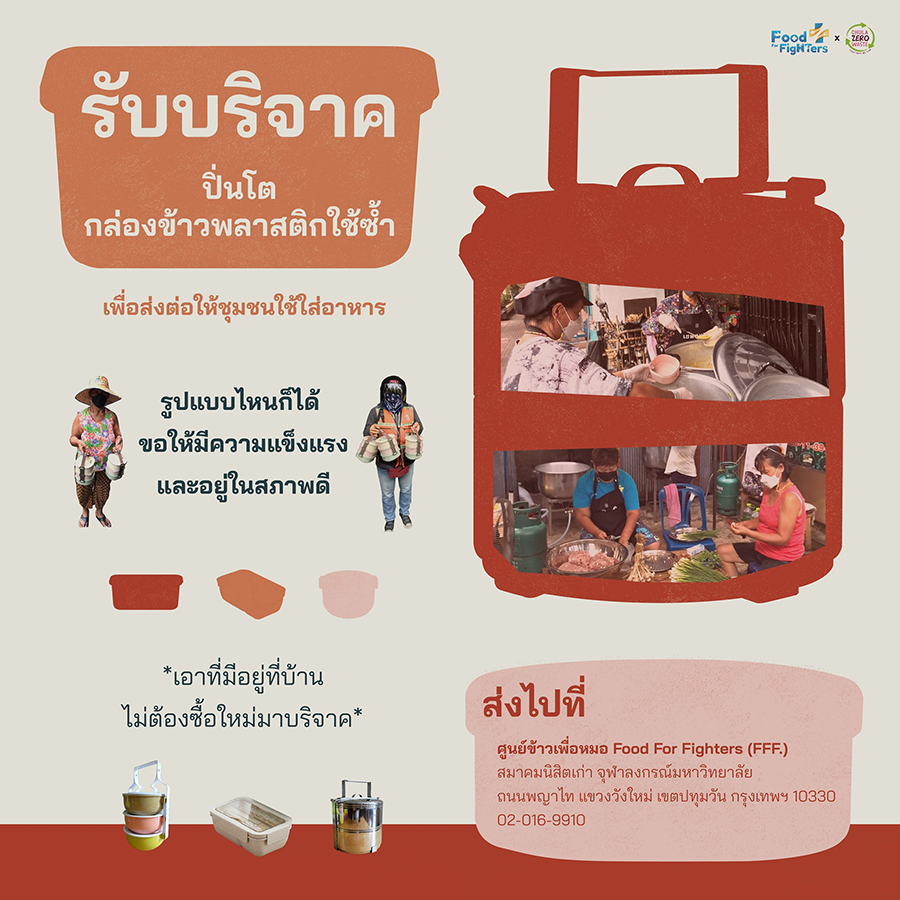 - เขียนแปะหน้ากล่องว่า "บริจาคปิ่นโต/กล่องข้าว" แล้วส่งปิ่นโต/กล่องข้าวไปที่ ศูนย์ข้าวเพื่อหมอ Food for Fighters (FFF) สมาคมนิสิตเก่า จุฬาลงกรณ์มหาวิทยาลัย ถนนพญาไท แขวงวังใหม่ เขตปทุมวัน กรุงเทพฯ 10330 โทร. 02-016-9910