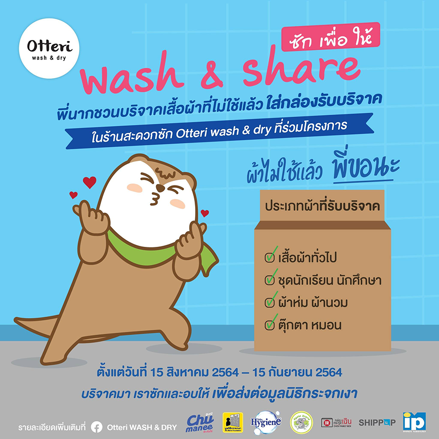 สำหรับใครที่อยากบริจาคเสื้อผ้าทั่วไป ชุดนักเรียน นักศึกษา ผ้าห่ม ผ้านวม ตุ๊กตา และหมอน แต่ไม่สะดวกซักเอง ช่วงนี้ Otteri Otteri WASH & DRY มีโครงการ Wash & Share "ซักเพื่อให้" เราสามารถนำผ้าไปวางที่กล่องรับบริจาคในร้านสะดวกซักที่เข้าร่วมโครงการได้เลย ทางร้านจะซักและอบฟรี เพื่อส่งต่อให้มูลนิธิกระจกเงา และกระจายต่อไปยังหน่วยงานที่ร่วมมือ 5 จังหวัด ได้แก่ กรุงเทพฯ, เชียงราย, เชียงใหม่, อุบลราชธานี และสงขลา โดยกิจกรรมมีตั้งแต่วันที่ 15 สิงหาคม 2564 - 15 กันยายน 2564 ถือว่าเป็นอีกหนึ่งตัวช่วยที่ทำให้เราทิ้งของที่เราไม่ได้ใช้ ช่วยทำให้ห้องโล่งขึ้น แถมยังได้ส่งต่อของไปให้มีประโยชน์ต่อผู้อื่นได้อีก