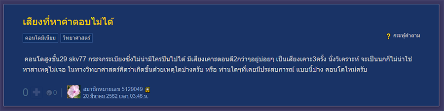 มีอีกหลายเสียงที่พูดคุยกันใน pantip.com ถึงเสียงที่ไม่รู้ที่มา หาต้นตอไม่ได้ ซึ่งถ้าเจอเสียงเหล่านี้ก็ยากที่จะจัดการ หรือแก้ไข แต่คิดว่าในทุกเสียงที่เกิดขึ้นย่อมมีที่มา เพียงแต่เราอาจจะยังไม่ทราบสาเหตุแน่ชัด อาจจะเป็นได้ทั้งเสียงที่เกิดจากคนข้างๆ ห้อง หรือห้องด้านบน หรือเป็นเสียงที่เกิดจากตัวอาคารเอง เพื่อที่จะแก้ไขปัญหาเหล่านั้น เราสามารถไปปรึกษากับทางนิติ และขอความคิดเห็นจากเจ้าของร่วมท่านอื่นๆ ว่าประสบปัญหาเดียวกันหรือไม่ เพื่อหาทางออกร่วมกันให้ได้ค่ะ