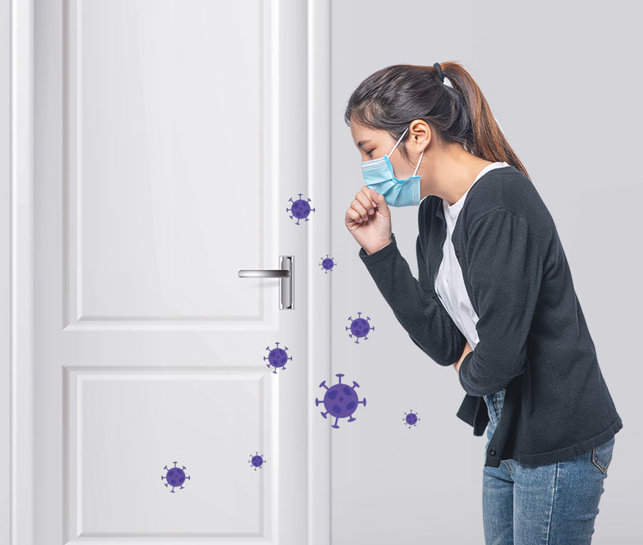 หากเพื่อนบ้านในคอนที่ติดเชื้อโควิด-19 บังเอิญเดินมาและหยุดไอหรือจามบริเวณหน้าห้องของเรา ก็ถือว่า "มีความเสี่ยง แต่ไม่มาก" เพราะเชื้อโควิด-19 สามารถอยู่ภายในอากาศหรือสิ่งแวดล้อมได้ 1-2 วัน หลังจากนั้นเชื้อจะตายไปเอง แต่จะไม่สามารถเข้าสู่ร่างกายเราได้ตราบใดที่เราไม่เอามือที่ปนเปื้อนเชื้อ หรือสัมผัสเชื้อมาจับบริเวณใบหน้า ตา จมูก ปาก