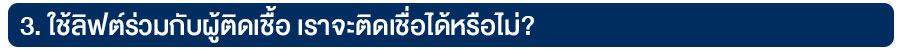 ภายในลิฟต์ ถือเป็นจุดเสี่ยงเนื่องจากเป็นพื้นที่ปิด แคบ และอากาศถ่ายเทไม่สะดวก โดยหากมีผู้ป่วยติดเชื้อใช้ลิฟต์ตัวเดียวกันกับเรา ก็มีโอกาสที่จะติดเชื้อได้ แต่จะเสี่ยงมากหรือน้อยต้องดูว่าผู้ป่วยคนนั้นสวมใส่หน้ากากหรือไม่ แล้วขณะอยู่ในลิฟต์ มีอาการไอ จาม ร่วมด้วยหรือไม่