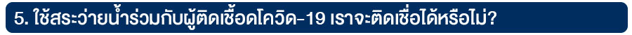 การว่ายน้ำในสระเดียวกันกับผู้ป่วยติดเชื้อ ไม่ทำให้ติดเชื้อโควิด-19 เนื่องจากสระว่ายน้ำจะมีระบบการฆ่าเชื้อเพื่อทำความสะอาดสระอยู่แล้ว เช่น ใส่คลอรีน เกลือ หรือ UV จึงปลอดภัย ซึ่งหากในสระมีปริมาณคลอรีนอยู่ในระดับมาตรฐานก็สามารถกำจัดเชื่อโควิด-19 ได้ แต่หากไปอยู่ใกล้ผู้ติดเชื้อตอนที่ไอหรือจาม ก็สามารถมีโอกาสติดเชื้อได้