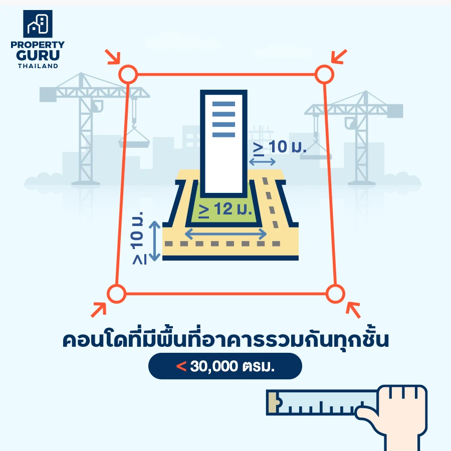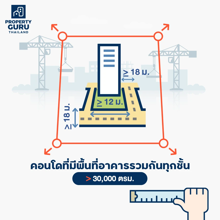 การกำหนดความกว้างของที่ดินและถนนนั้น จะกำหนดเฉพาะคอนโด High rise ที่มีพื้นที่ของอาคารรวมกันทั้งหมดตั้งแต่ 10,000 ตารางเมตรขึ้นไป จะต้องปฏิบัติตามกฎกระทรวงฉบับที่ 33 (พ.ศ. 2535) ข้อ 2 ดังนี้