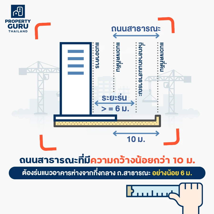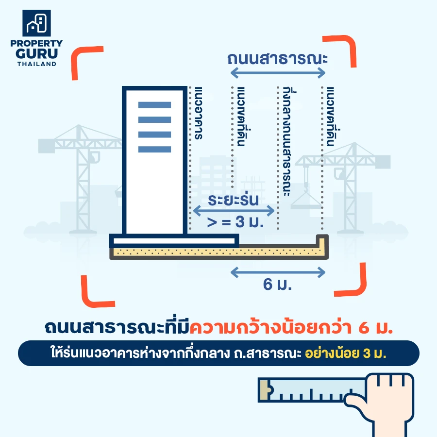 1. ถ้าถนนสาธารณะกว้างน้อยกว่า 10 เมตร ต้องร่นแนวอาคารห่างจากกึ่งกลางถนน สาธารณะอย่างน้อย 6 เมตร