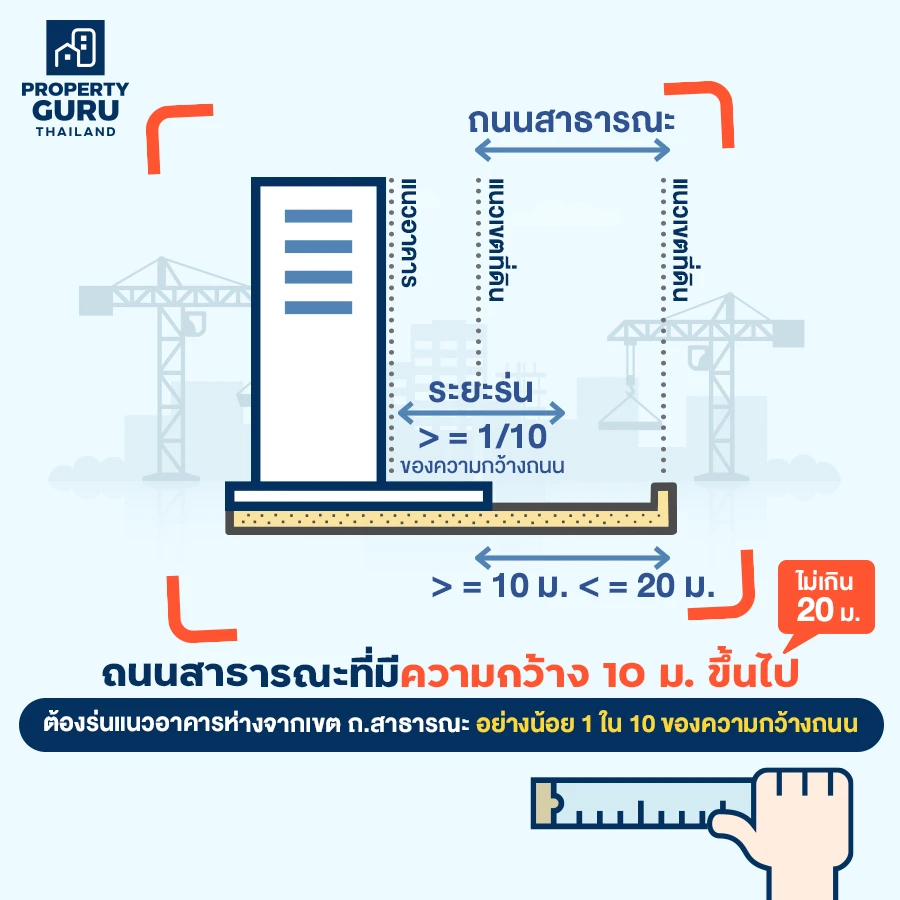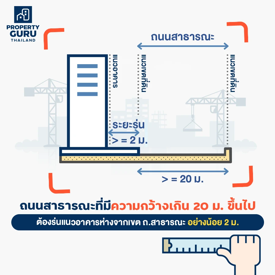 3. ถ้าถนนสาธารณะมีความกว้างเกิน 20 เมตรขึ้นไป ต้องร่นแนวอาคารห่างจากเขตถนนสาธารณะอย่างน้อย 2 เมตร