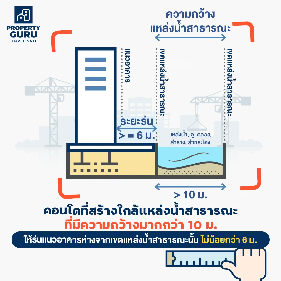 2. แต่ถ้าแหล่งน้ำ สาธารณะ ที่มีความกว้างมากกว่า 10 เมตร ให้ร่นแนวอาคาร ไม่น้อยกว่า 6 เมตร