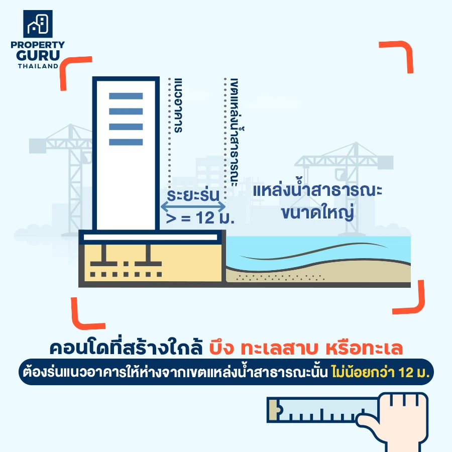 และสำหรับคอนโดริมน้ำบรรยากาศดีๆ ที่เราชอบกันนั้นก็มีข้อกำหนดตามกฎกระทรวง ฉบับที่ 55 (พ.ศ. 2543) ออกตามความในพระราชบัญญัติควบคุมอาคาร พ.ศ. 2522 หมวด 4 ข้อ 42 ดังนี้