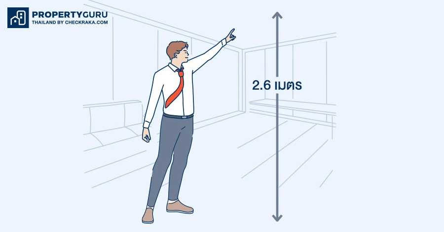 กฎกระทรวง ฉบับที่ 55 (พ.ศ. 2543) ออกตามความในพระราชบัญญัติควบคุมอาคาร พ.ศ. 2522 หมวด 2 ข้อ 22 ได้กำหนด ว่าที่พักอาศัยต้องมีระยะดิ่ง ไม่น้อยกว่า 2.6 เมตร ถ้าหากเราสอบถามโครงการแล้วพบว่าน้อยกว่านี้ไม่ควรซื้อค่ะ เพราะในห้องก็จะอึดอัดและมีผลทำให้ระบายอากาศได้ไม่มีเท่าที่ควรด้วยค่ะ อย่างไรก็ตามต้องถามดูให้ละเอียดนะคะว่า 2.6 เมตรรวมการใส่ฝ้าเพดานแล้วหรือยัง บางที่อาจจะก่อสร้างตัวโครงโครงมา 2.6 เมตร ใส่ฝ้าเข้าไปเหลือ 2.4-2.5 เมตรก็มีค่ะ